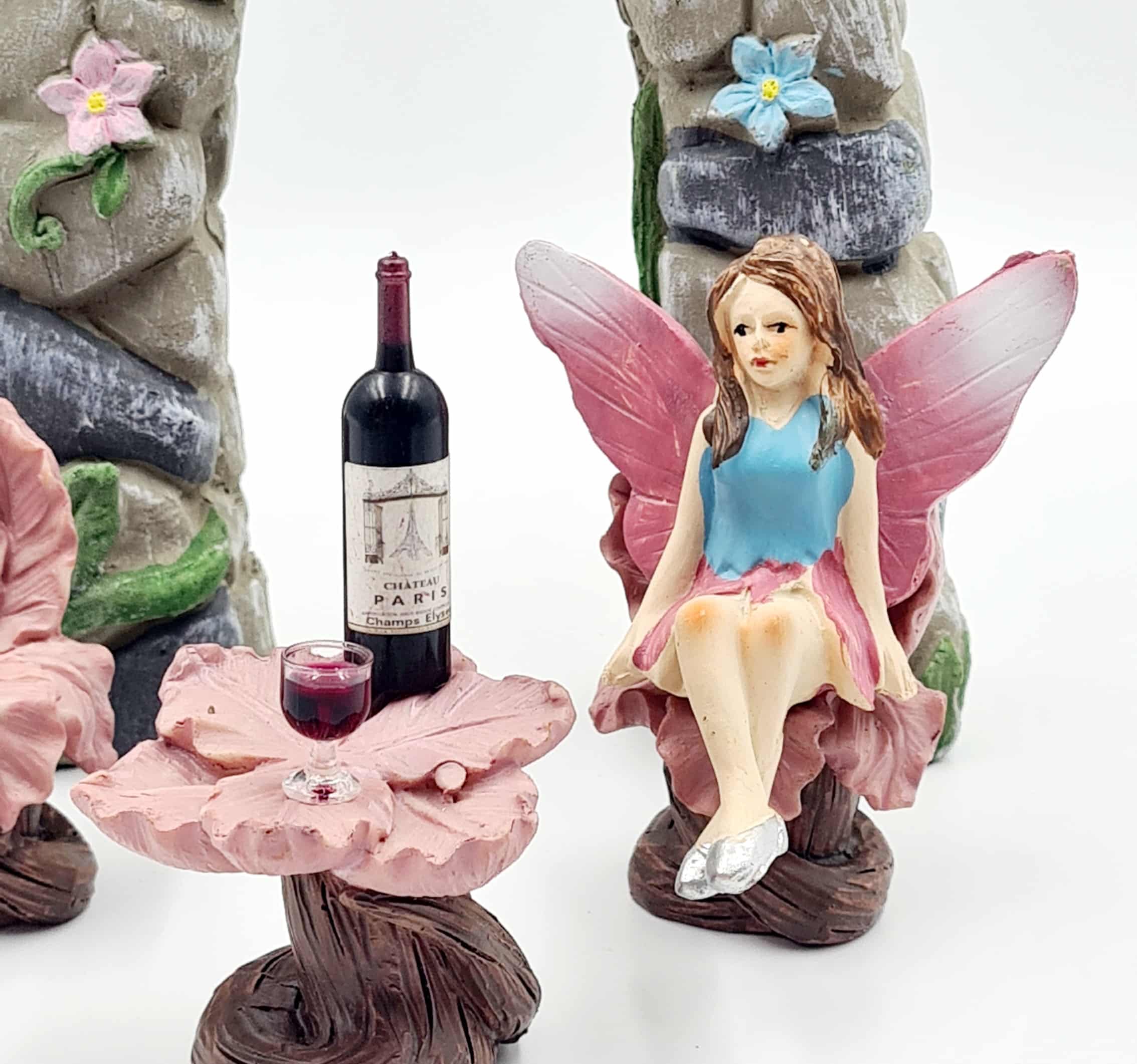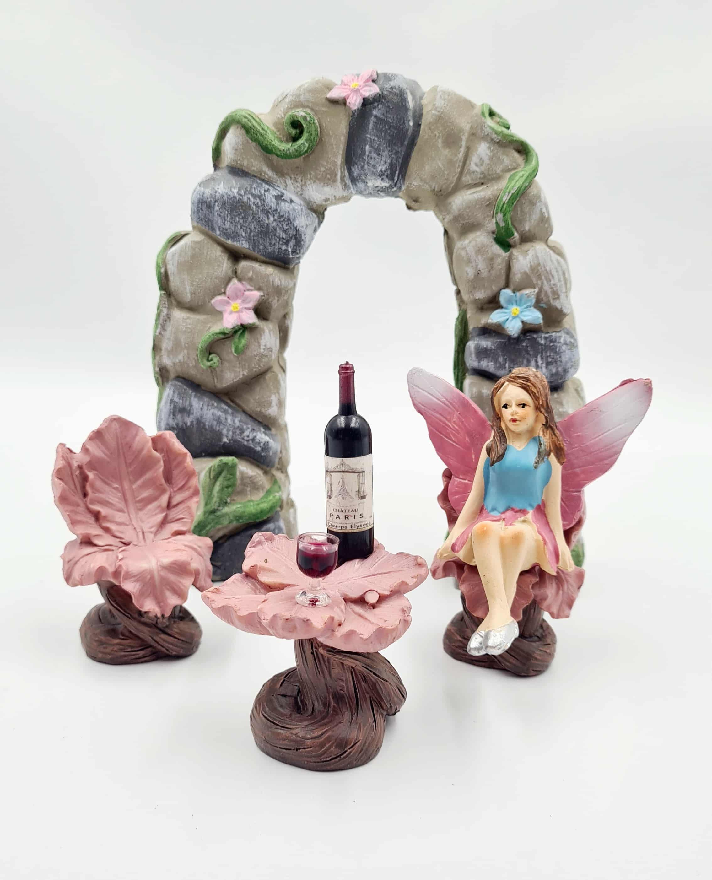 Create a charming little scene in your fairy garden with this beautiful set. It features a stone-effect archway, beautifully decorated with winding vines and delicate flowers, forming a magical entrance for your fairy world. Inside, a pretty pink flower table with two matching chairs waits, ready for cosy chats and tiny celebrations. A sitting fairy (colours will vary) enjoys a bottle of red wine with a little glass, making this the perfect spot for peaceful fairy moments.