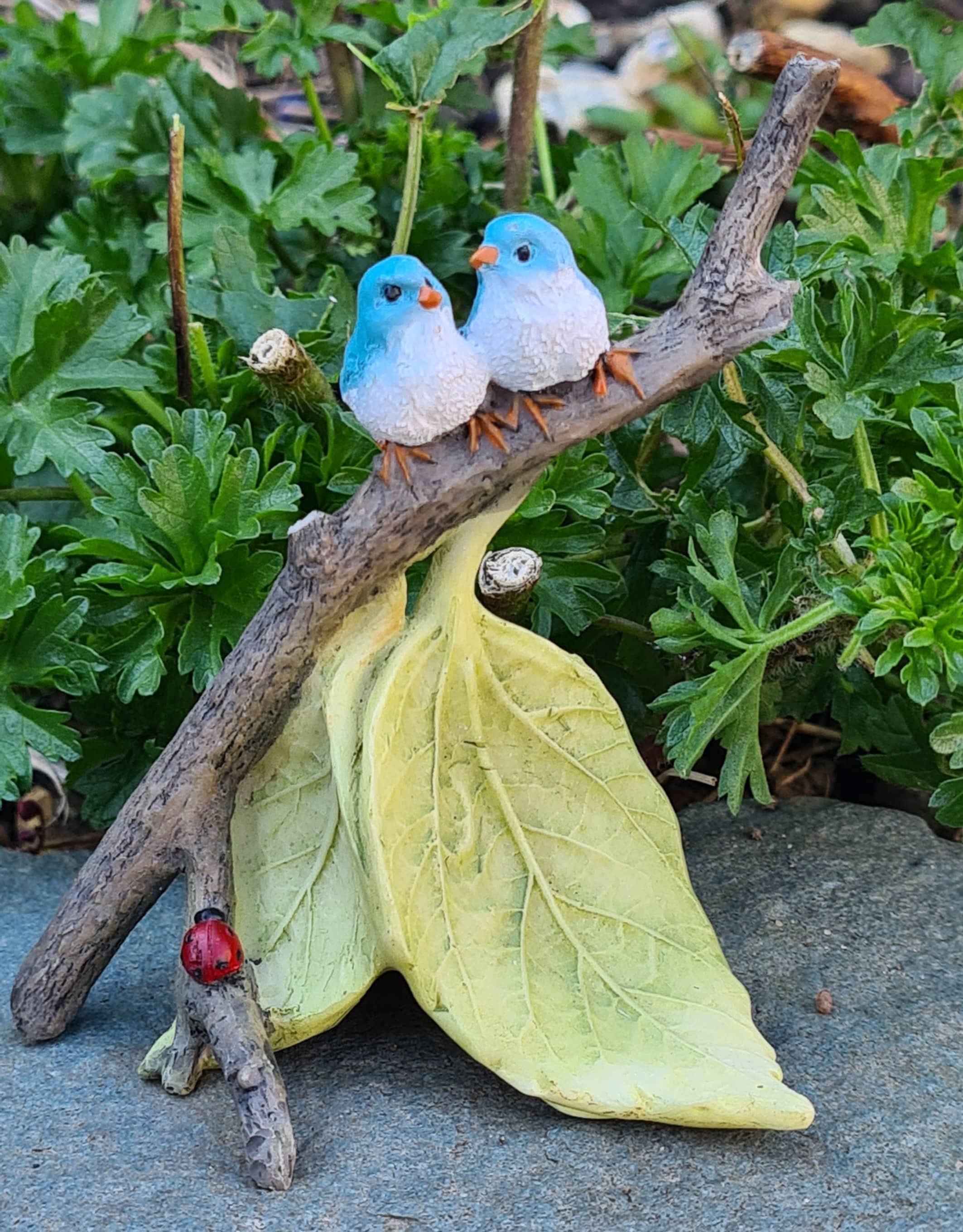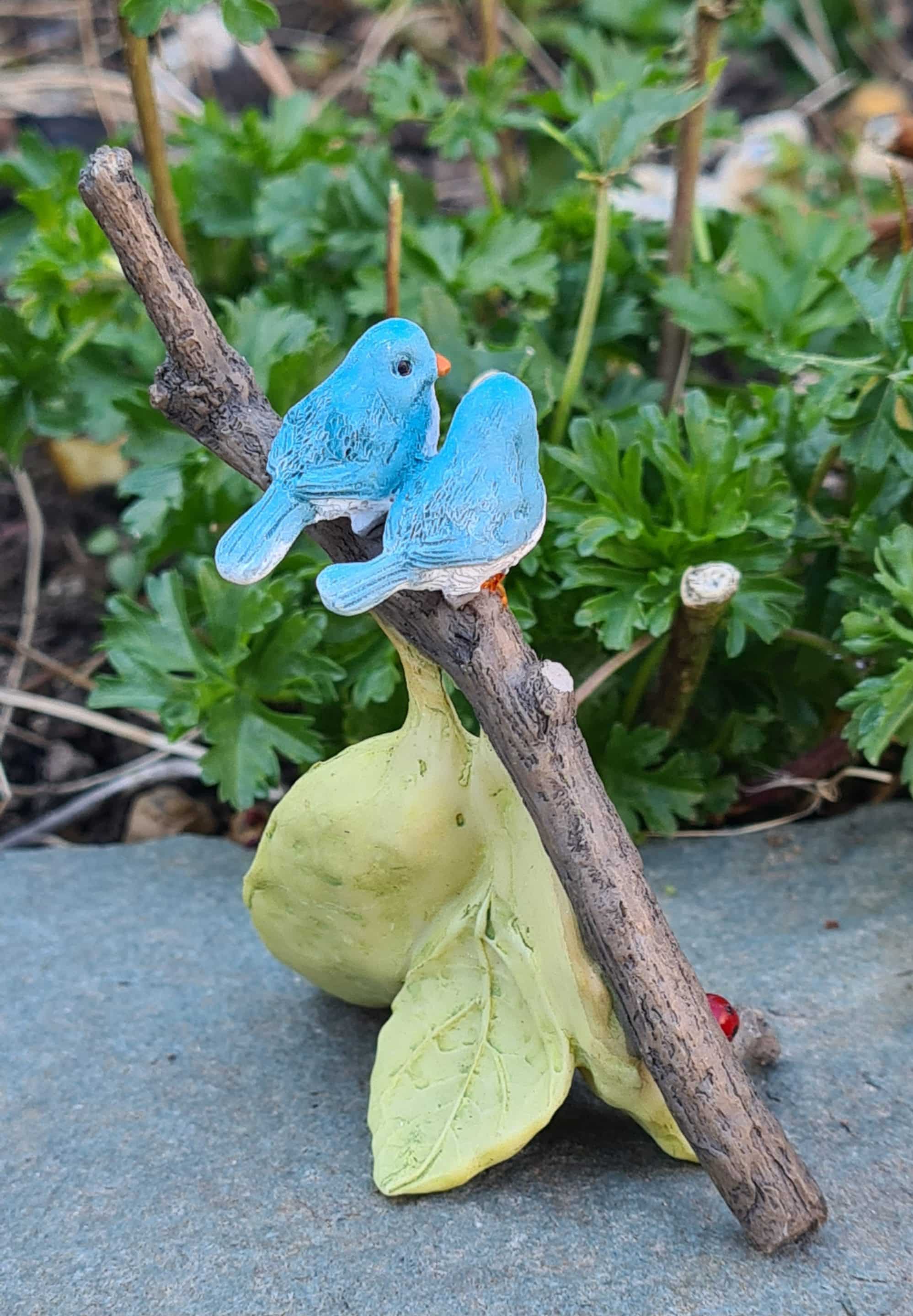 Add a sweet woodland touch to your fairy garden with this charming blue bird ornament. Featuring two little blue birds sitting side by side on a rustic tree branch, this lovely piece is set above soft green leaves and finished with a tiny red ladybird detail at the base. Perfect for fairy gardens, miniature displays, plant pots, or woodland scenes, it brings a peaceful and cheerful feel wherever it is placed.
