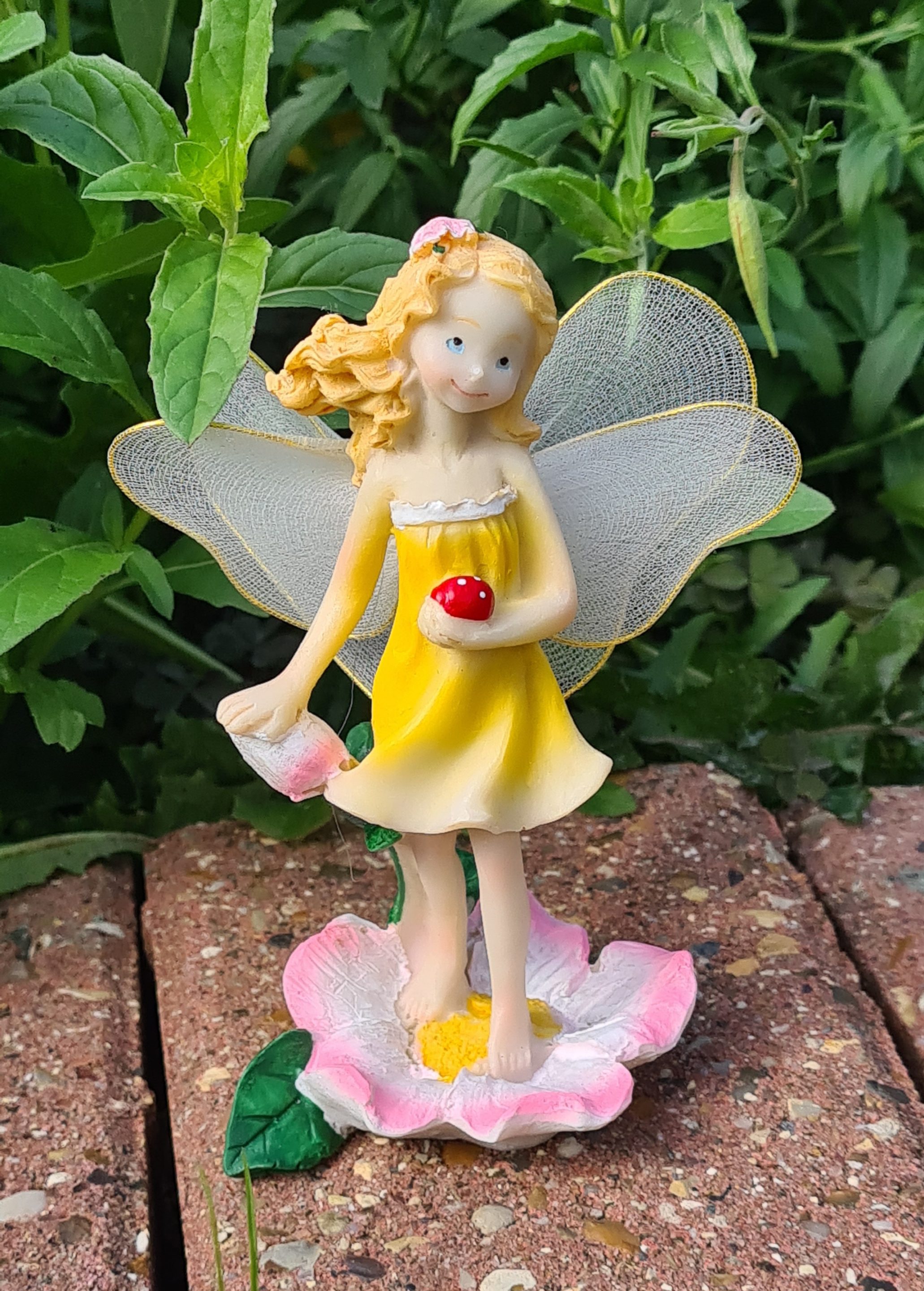 - This yellow fairy with large net wings stands on a pink and white flower, holding a small red toadstool