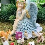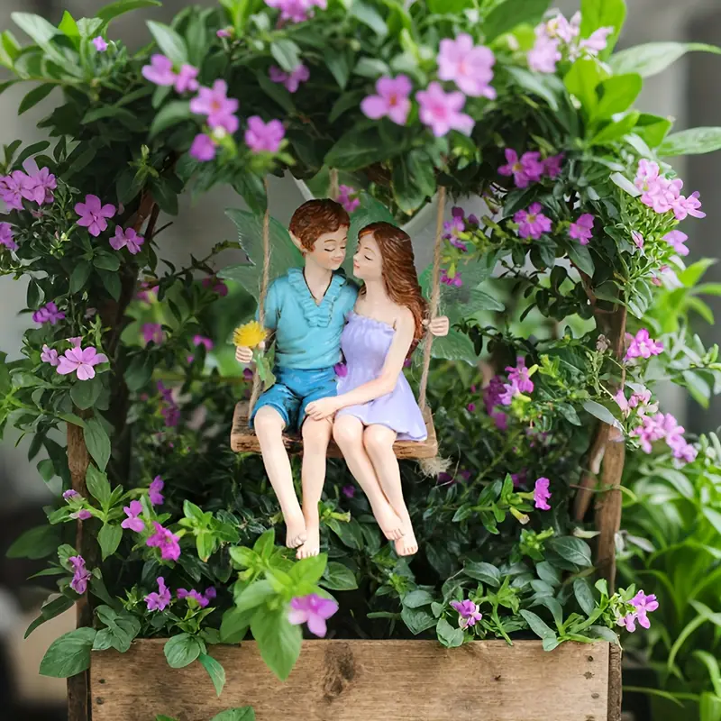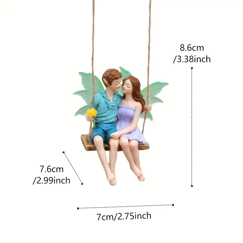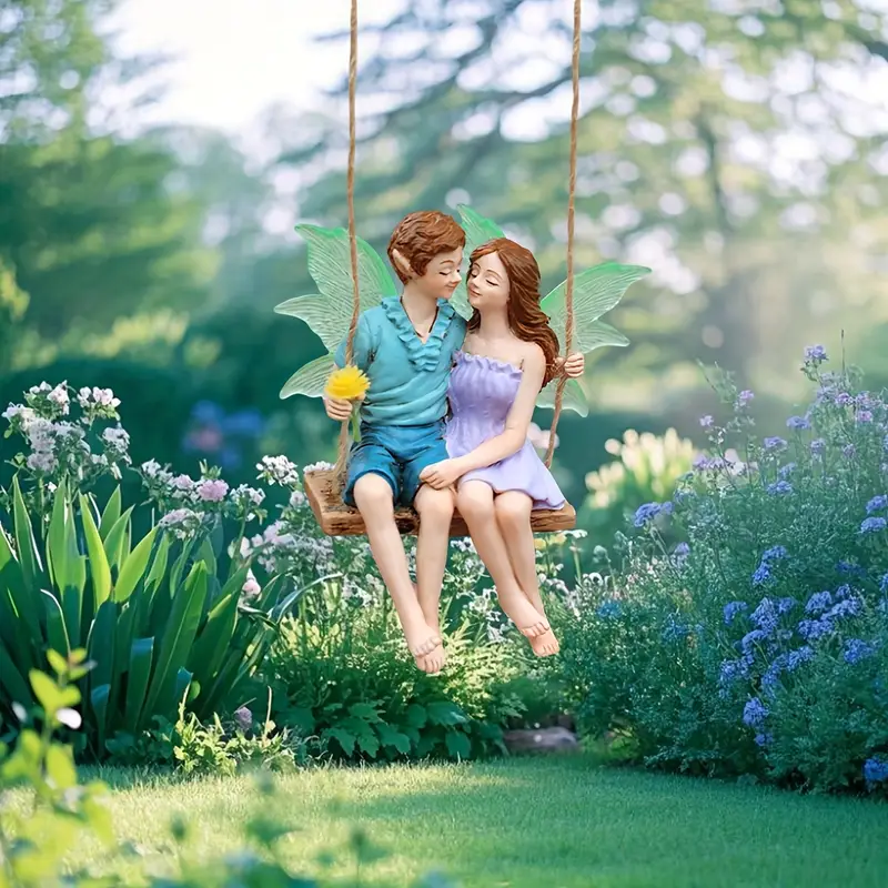 Our lovely fairy couple sits on a rope swing, swaying gently among blooming flowers.