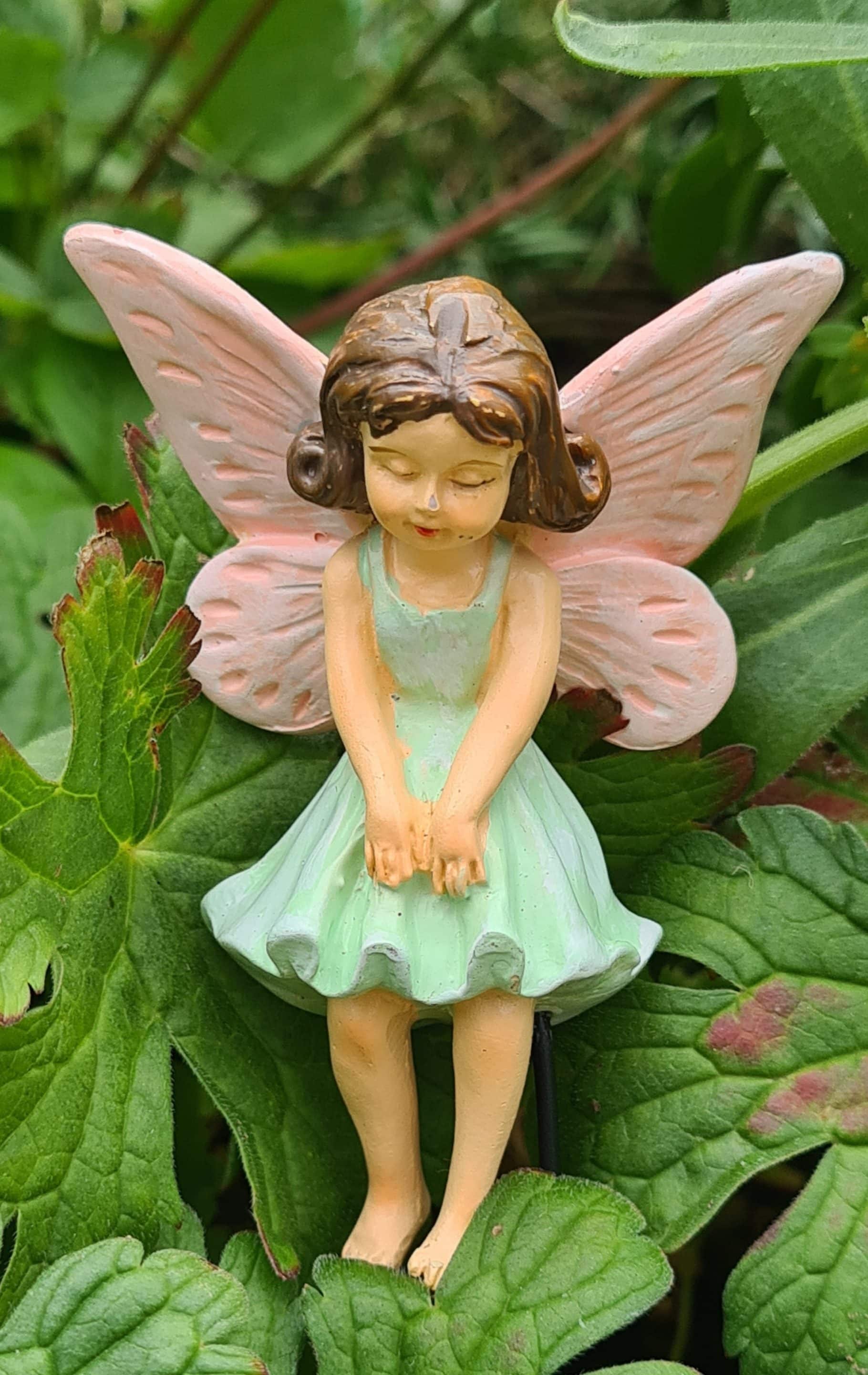 - Green fairy with pink wings, standing with her hands on her dress ,she is looking down ( 7cm high )