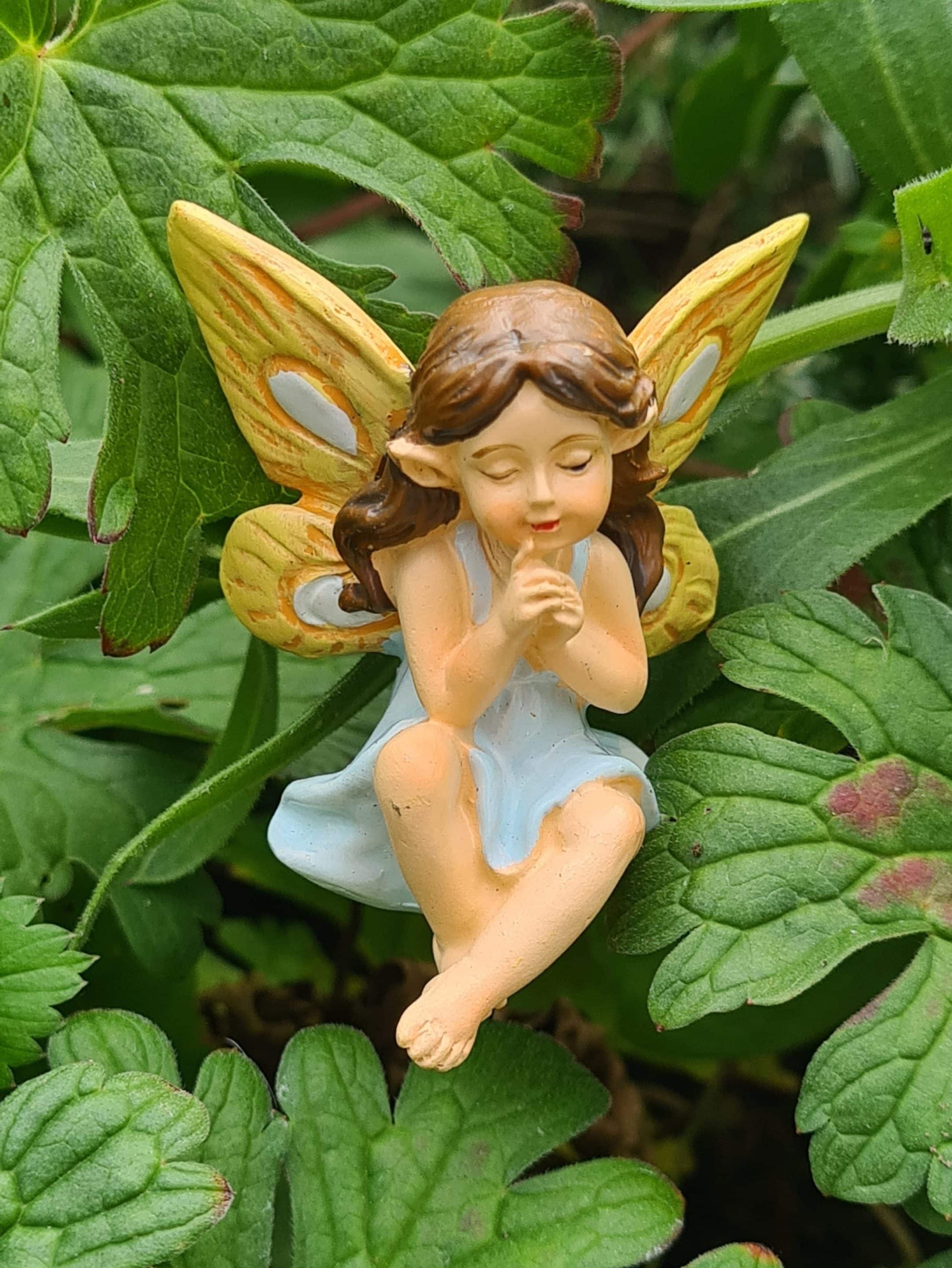 - Light blue fairy with yellow wings, she is sitting crossed legs and finger on her chin ( 5cm high)