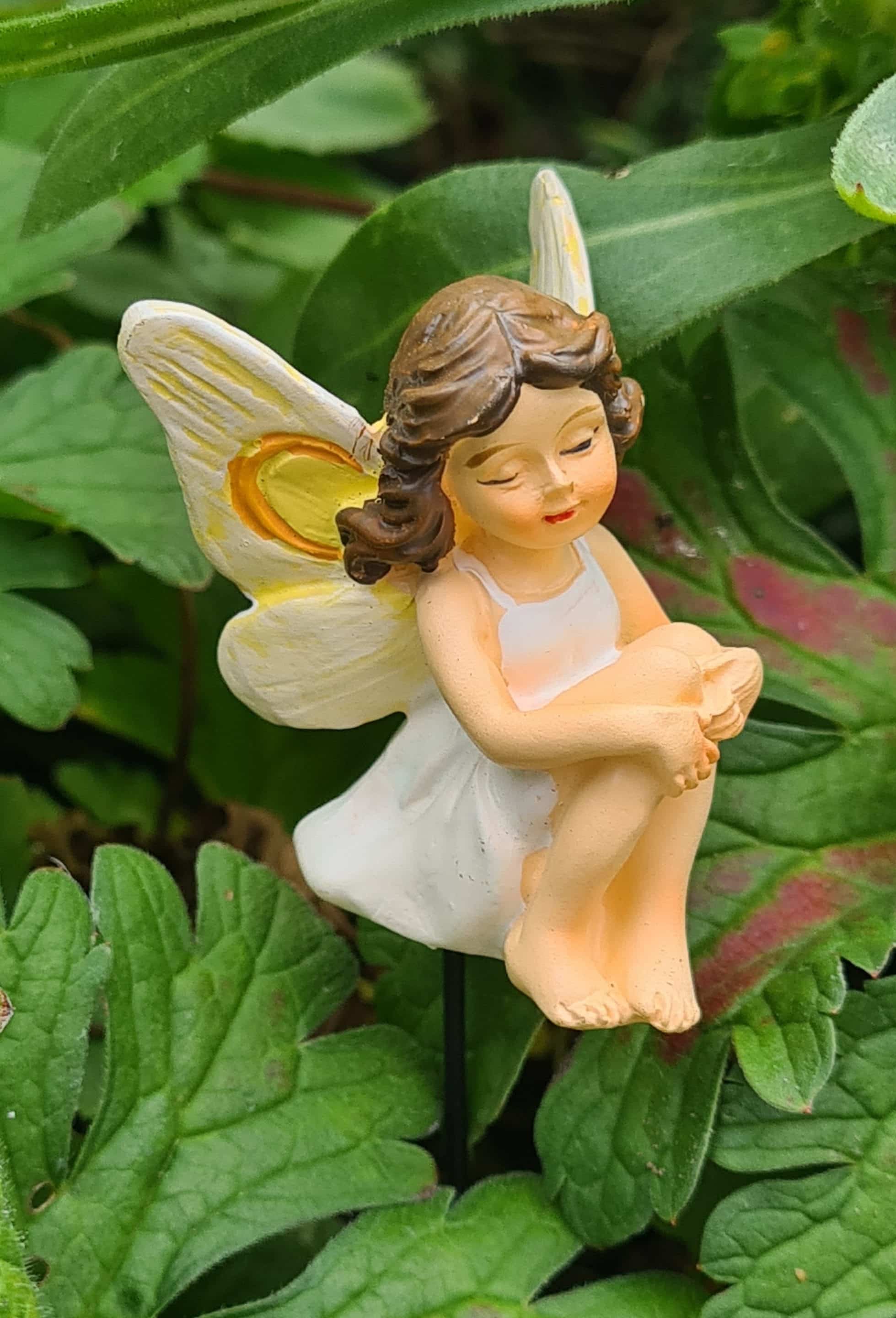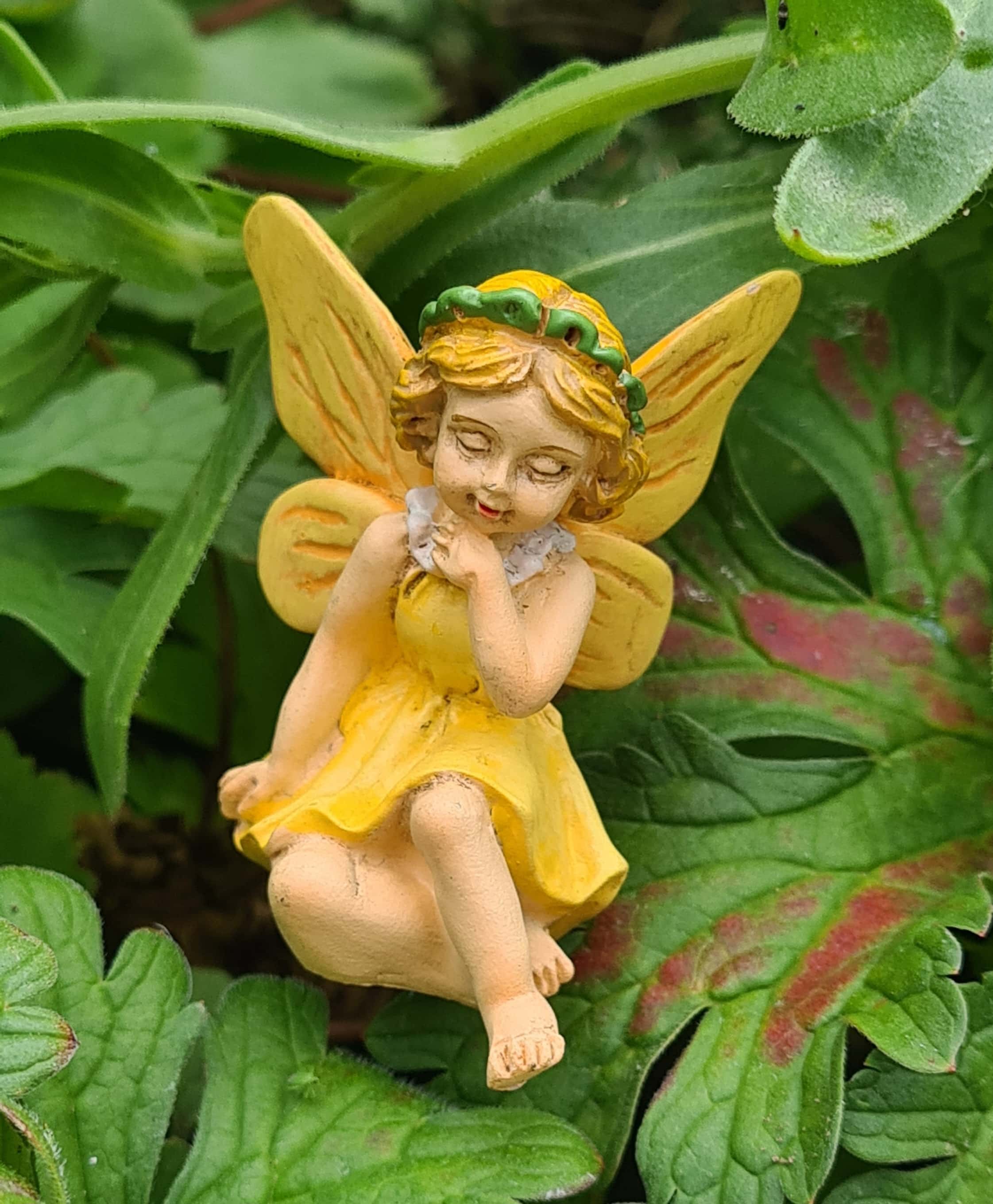 - Yellow fairy with yellow wings, she is sitting with her arm under her chin ( 5cm high)