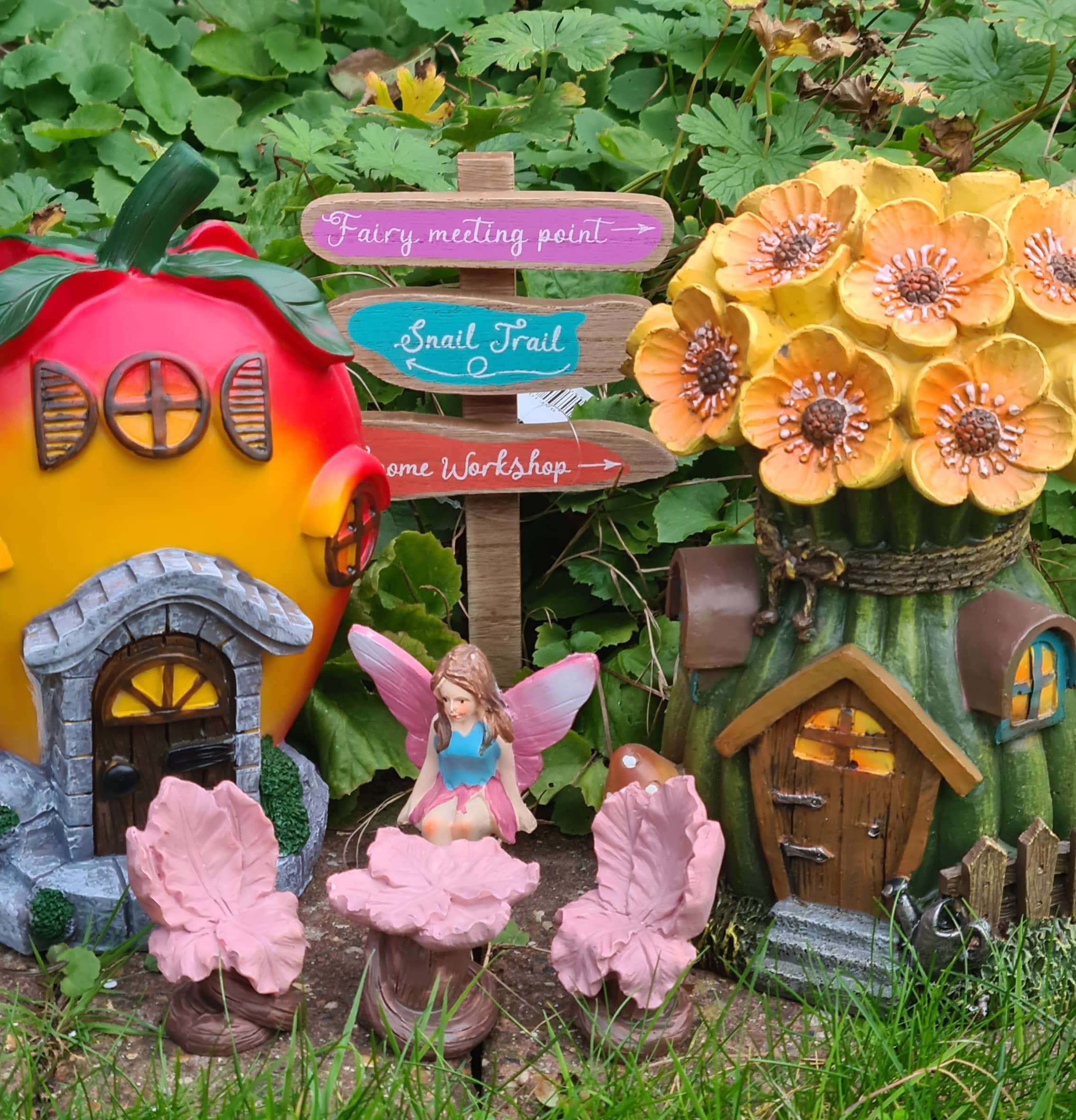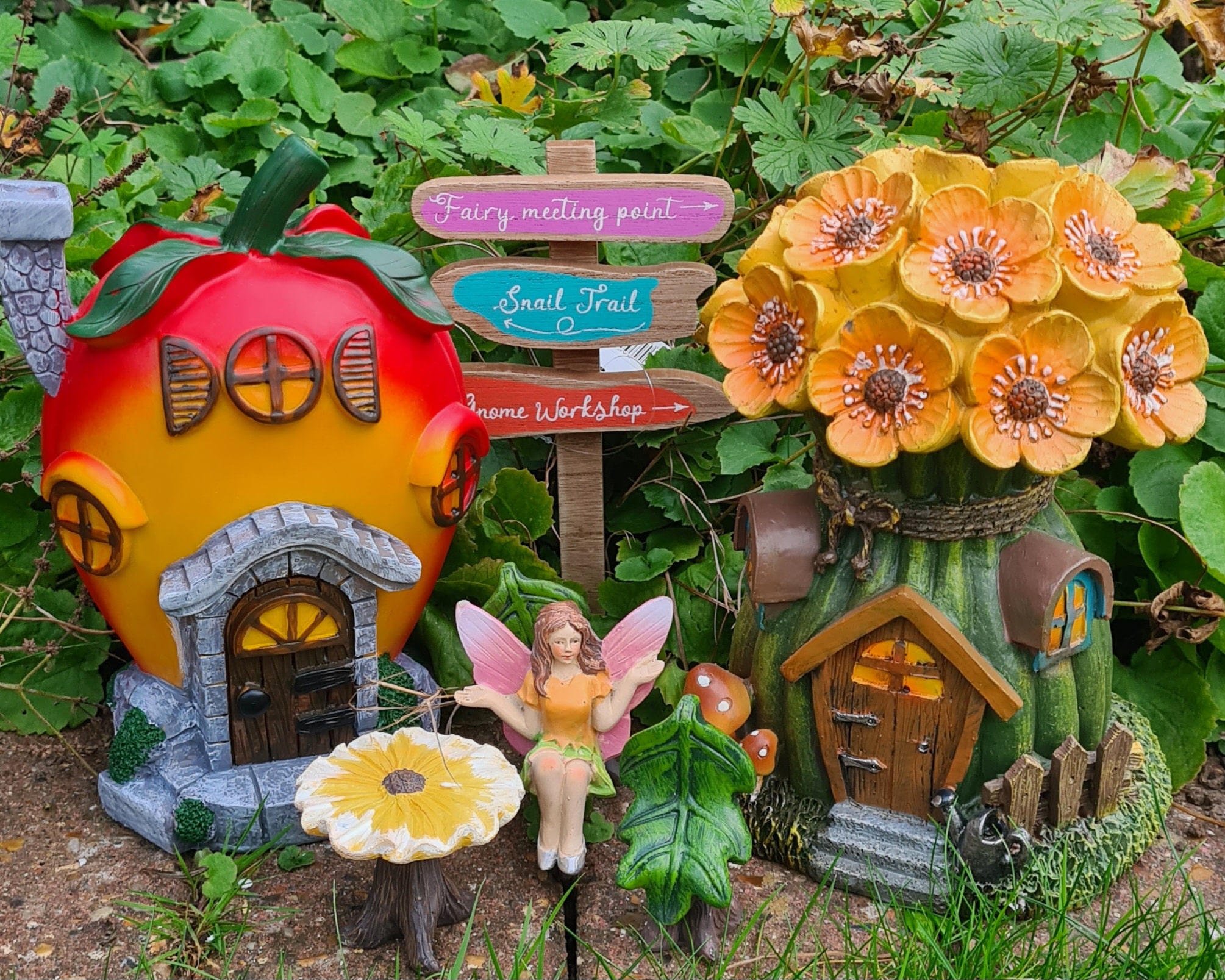 Create a cheerful and enchanting scene in your fairy garden with this beautifully coordinated Apple and sunflower set complete with charming furniture and a friendly fairy companion.