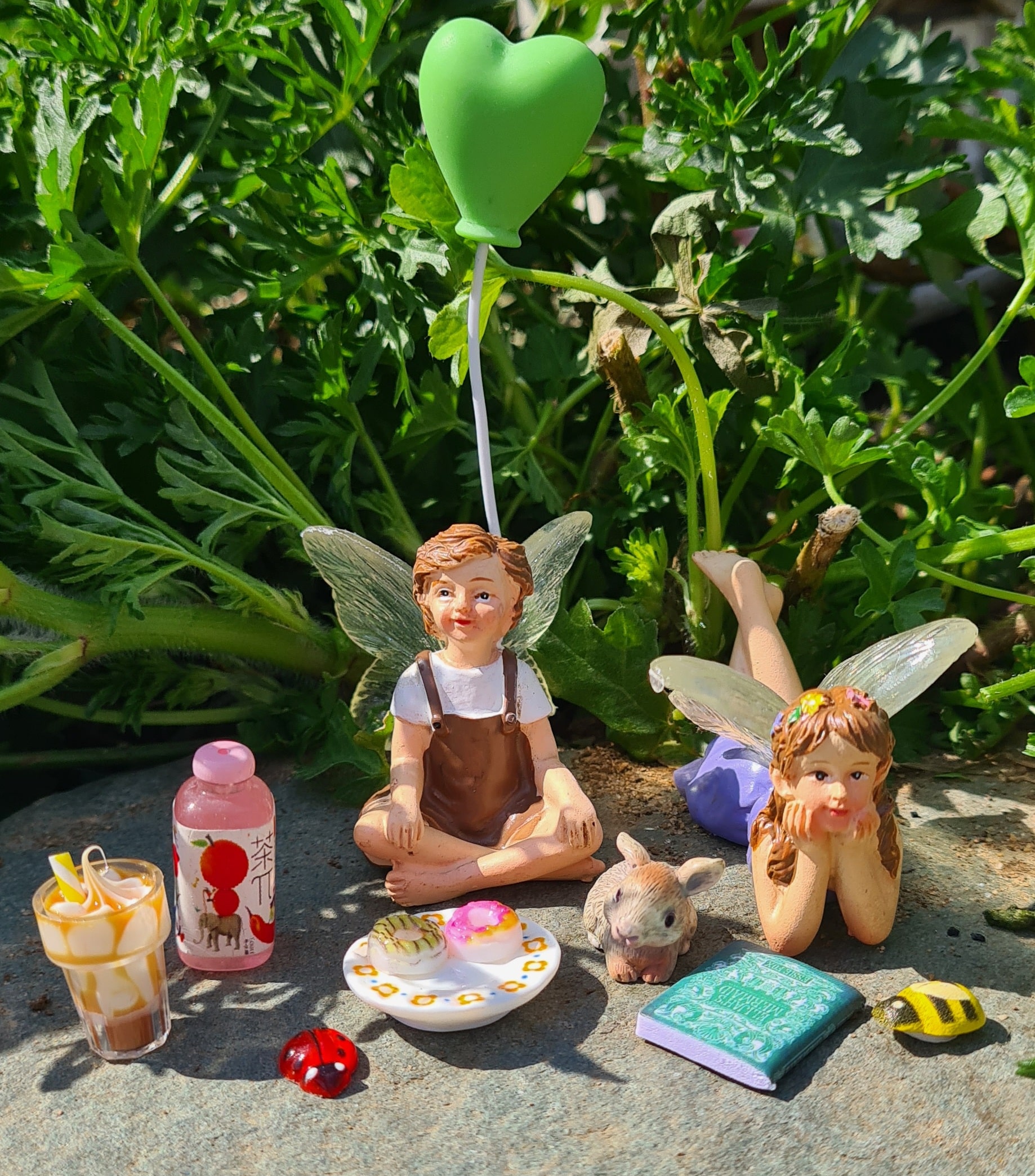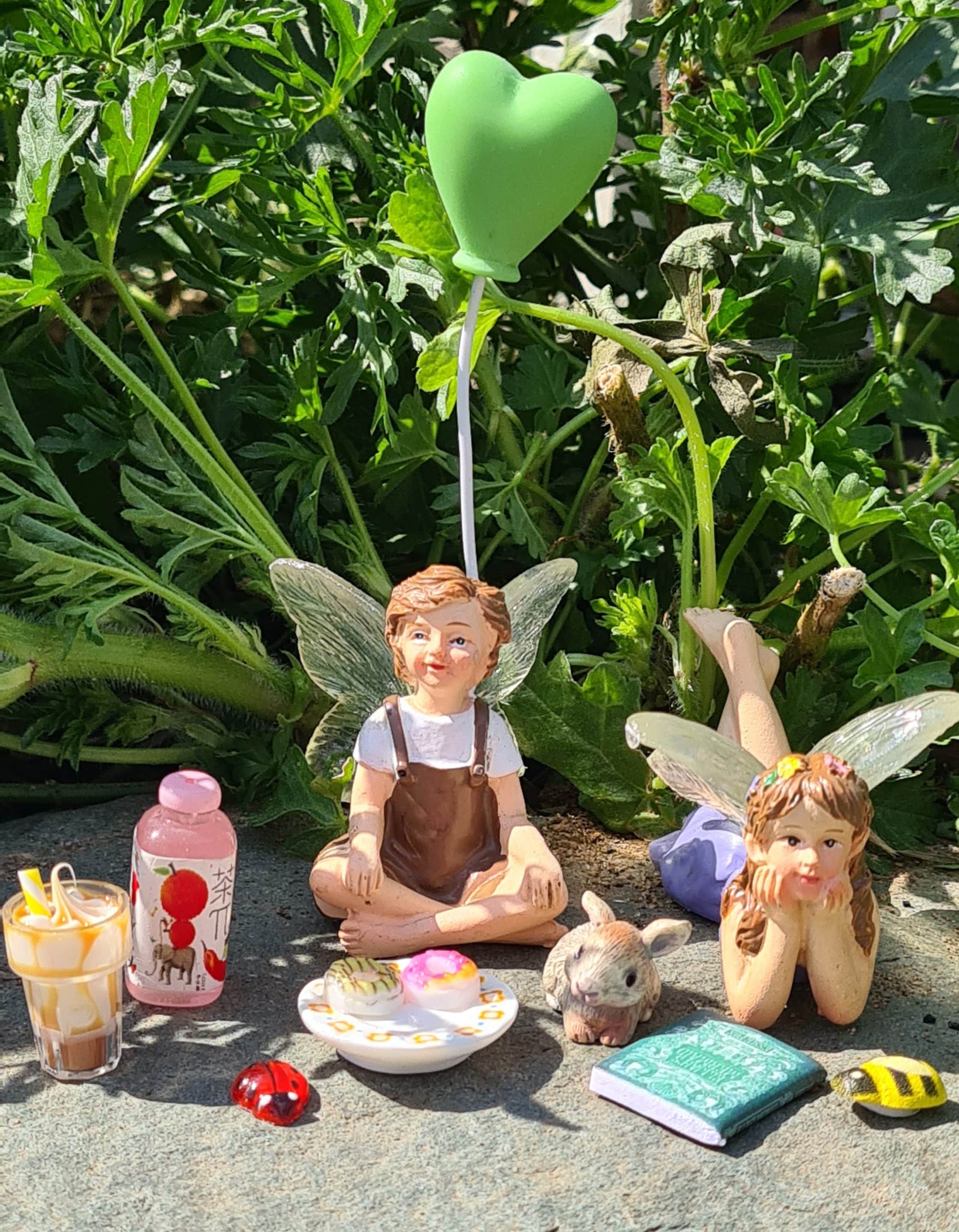 Create a sweet little garden scene with this charming Fairy Garden Tea Time Set. Featuring two fairy figures, a tiny bunny, a green heart balloon, miniature treats, drinks, a book, ladybird and bee, this set is perfect for adding a playful story to any fairy garden, planter, pot or outdoor display.