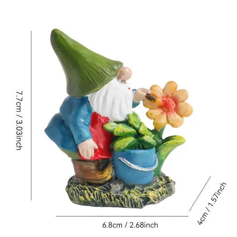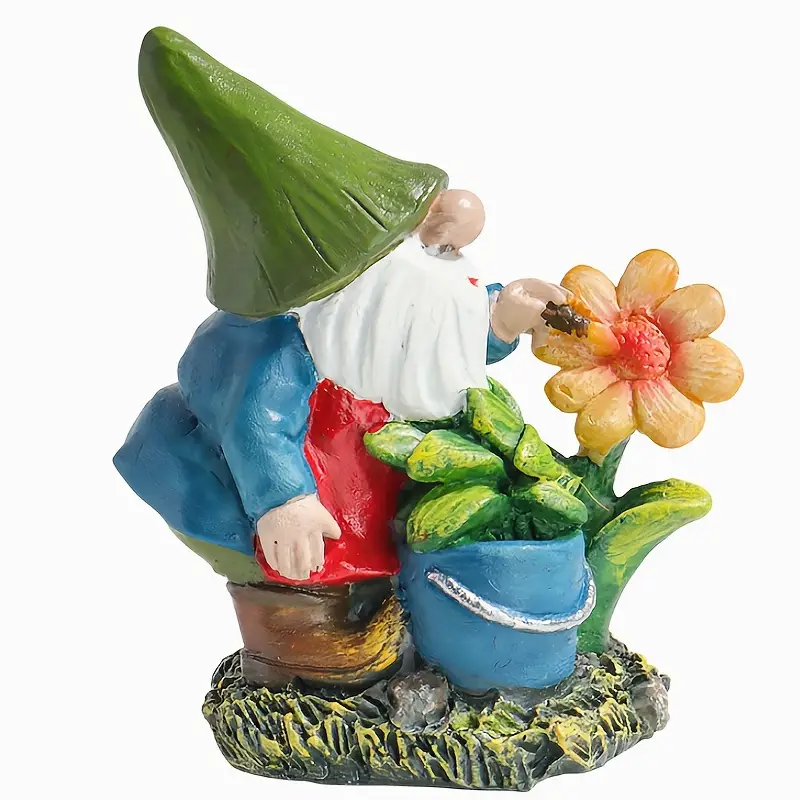 Our cheerful gnome stands proudly with his flower pot, bursting with bright blooms. A charming garden friend, he adds a touch of colour to any outdoor space.